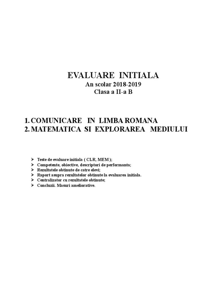 08/02/2018 · evaluare initiala mem si clr. .. Materialul didactic îți va permite să identifici nivelul de cunoștințe al fiecărui elev, iar acest lucru va fi un real ajutor în crearea planurilor de lecție.