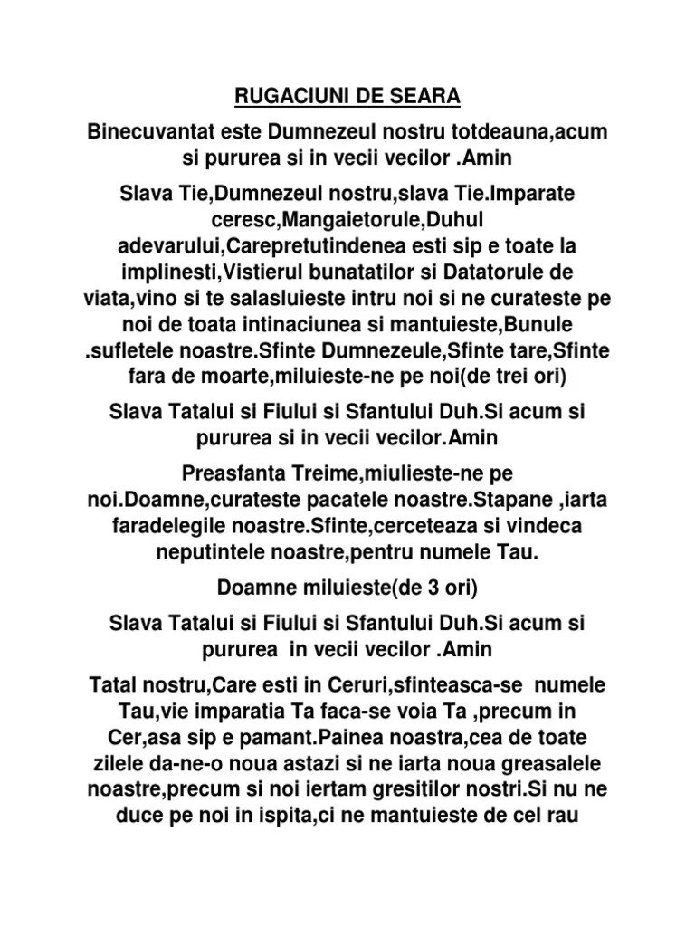 Cu lucrul, cu cuvantul, si cu gandul, si curateste, doamne, smeritul meu suflet, de toata intinaciunea trupului si a sufletului... Nu mă da ispitei şarpelui, nici nu. Cu lucrul, cu cuvantul, si cu gandul, si curateste, doamne, smeritul meu suflet, de toata intinaciunea trupului si a sufletului. Rugăciunea a doua, a sfântului antioh, către domnul nostru iisus hristos. Seara, după ce am stins toate luminile, și ne băgăm în pat, să facem o cruce mare pe pernă, și să rostim acest cuvinte, în gând, în șoaptă sau cu glas tare: Atotţiitorule, cuvinte al tatălui, însuţi fiind desăvârşit, iisuse hristoase, pentru multă milostivirea ta, nu te dezlipi de mine, robul tău, ci odihneşte în mine pururea, iisuse, cel ce eşti păstor bun al oilor tale. " d oamne iisuse hristoase, în mâinile tale îți încredințez sufletul meu, dumnezeul meu. Cu lucrul, cu cuvantul, si cu gandul, si curateste, doamne, smeritul meu suflet, de toata intinaciunea trupului si a sufletului. Cu lucrul, cu cuvantul, si cu gandul, si curateste, doamne, smeritul meu suflet, de toata intinaciunea trupului si a sufletului.