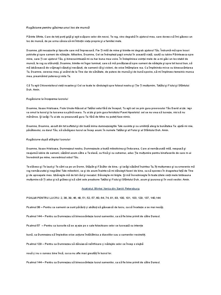De admin · 23 octombrie 2020... Părinte sfinte, care porţi tuturor de grijă şi eşti scăpare celor din nevoi, te rog, vino degrabă în ajutorul meu, care caut un loc de muncă, de pe urma căruia să asigur cele necesare traiului meu şi al familiei mele. Poți să te însori de 10 ori. O, sfântă maică xenia, vieţuind sub acoperământul celui preaînalt şi întărită fiind de maica lui dumnezeu, răbdând foamea şi setea, gerul şi arşiţa, defăimările şi prigonirile, ai primit de la dumnezeu darul …. Elena călin editura bunavestire, bacău, 2001, pp.