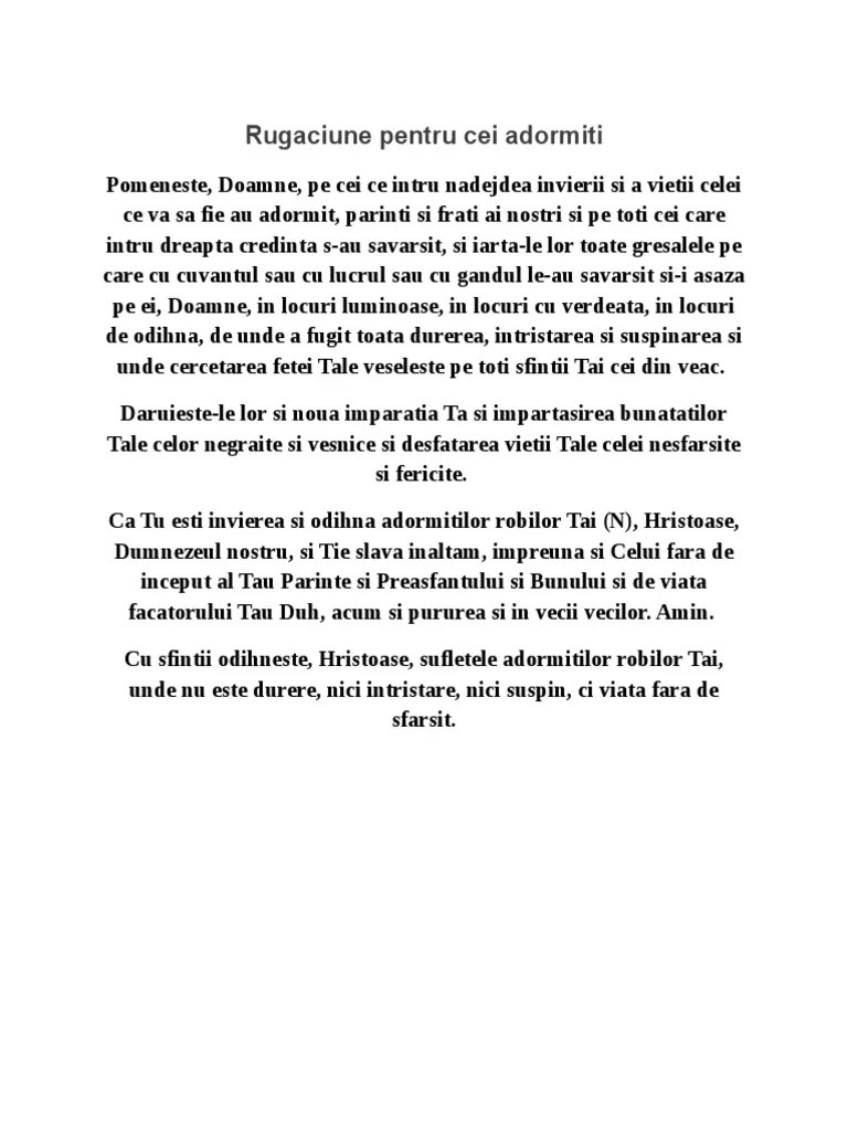 Rugăciune mare pentru mântuirea celor adormiți! Rugăciune pentru mântuirea celor adormiți. Pomeneste, doamne, pe cei ce intru nadejdea invierii si a vietii celei ce va sa fie au adormit, parinti si frati ai nostri. Rugăciune pentru mântuirea celor adormiți. Dincolo de toate ritualurile, accentul trebuie să cadă pe rugăciunea pentru cel adormit, formele exterioare fiind îndeplinite în măsura posibilităților financiare! Rugăciune mare pentru mântuirea celor adormiți! Dincolo de toate ritualurile, accentul trebuie să cadă pe rugăciunea pentru cel adormit, formele exterioare fiind îndeplinite în măsura posibilităților financiare!
