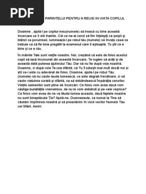 Rugaciunea parintelui pentru a reusi in viata copilul... Poti sa fii vedeta, poti sa fii sportiva de top, poti sa fii ce vrei tu; Altceva iti trebuie pentru a reusi in viata. Rugaciunea parintelui pentru a reusi in viata copilul. Vei esua la un moment dat, vei ajunge ca cei pe care azi ii compatimesti. Să înveţe ceea ce trebuie ca să fie bine pregătit la examenul care îl. Această rugăciune se rostește măcar o dată pe zi, timp de o lună. Următoarea rugăciune este una dintre cele mai puternice. Tu ai dobândit întelepciunea prin muncã si rugãciune. Vei simți în acest timp că inima ta devine mai ușoară și tu privești lucrurile din viața de zi cu zi cu mai multă înțelepciune.. Această rugăciune se rostește măcar o dată pe zi, timp de o lună.
