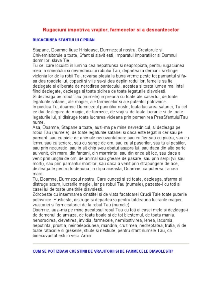 Ciprian imbunatatita, completata, astfel incat ea sa fie mai eficienta. Împăratul împăraților și domnul domnilor, slavă ție. 01.10.2019 · rugăciunea sfântului ciprian, cea mai puternică! 02.10.2019 · rugăciune sf ciprian pentru izbăvirea farmecelor și blestemelor. Stăpâne doamne iisuse hristoase, dumnezeul nostru, creatorule și chivernisitorule a toate, sfânt și slăvit ești; 20.01.2021 · rugăciunea sfântului mucenic ciprian, pentru izbăvirea de vrăji, blesteme și de toată lucrarea diavolească. Rugăciunea sfântului mucenic ciprian, pentru izbăvirea de vrăji, blesteme și de toată lucrarea diavolească. Ciprian imbunatatita, completata, astfel incat ea sa fie mai eficienta.. Rugăciunea sfântului mucenic ciprian, pentru izbăvirea de vrăji, blesteme și de toată lucrarea diavolească.
